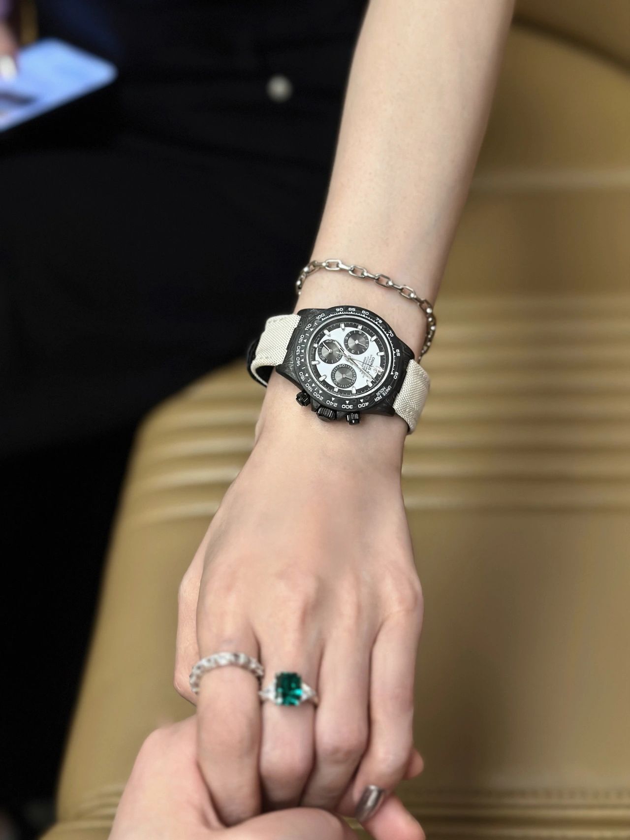 The Cosmic Daytona Series is a specially designed style combining together with the prototype of Rolex Daytona and with many different world ideas. It is an odometer version ideal for calculating up to 400 speed units per hour. The concept is designed to be stylish and combining of all the finishing on the design of a high-grade Carbon Fiber frame that is lightweight, comfortable, and extremely durable. Smooth texture with premium leather-trimmed canvas watch band at the clasp. All of which not only make it more comfortable to wear, but also enhance the shape with perfect function. Cronus Art has added free style, vitality and changed the Daytona feel to a brand new world on your wrist.
