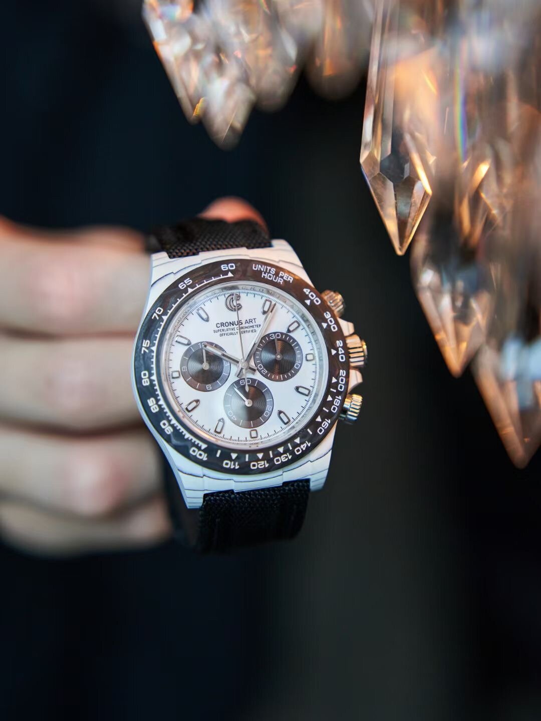 The Cosmic Daytona Series is a specially designed style combining together with the prototype of Rolex Daytona and with many different world ideas. It is an odometer version ideal for calculating up to 400 speed units per hour. The concept is designed to be stylish and combining of all the finishing on the design of a high-grade Carbon Fiber frame that is lightweight, comfortable, and extremely durable. Smooth texture with premium leather-trimmed canvas watch band at the clasp. All of which not only make it more comfortable to wear, but also enhance the shape with perfect function. Cronus Art has added free style, vitality and changed the Daytona feel to a brand new world on your wrist.